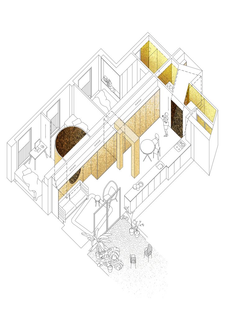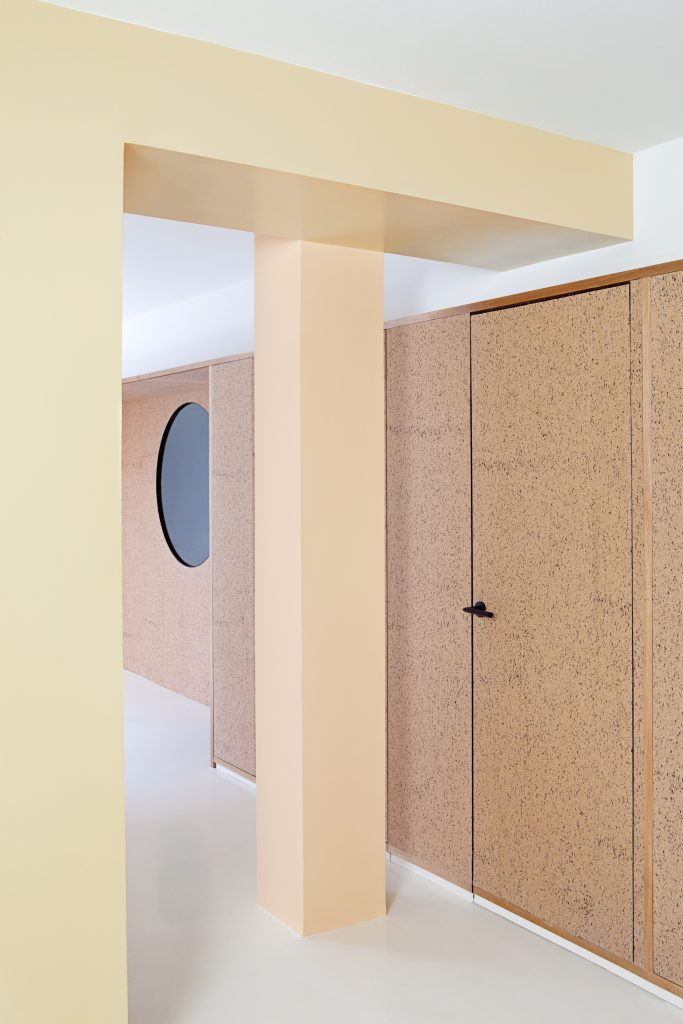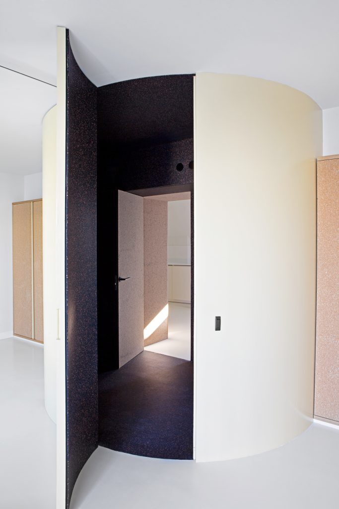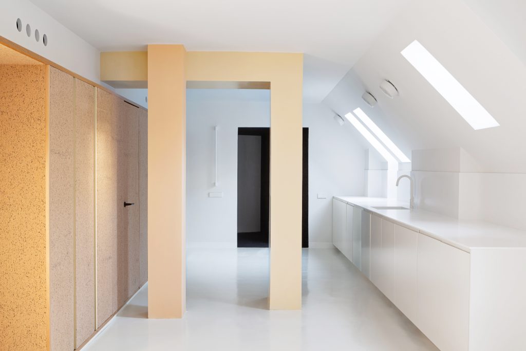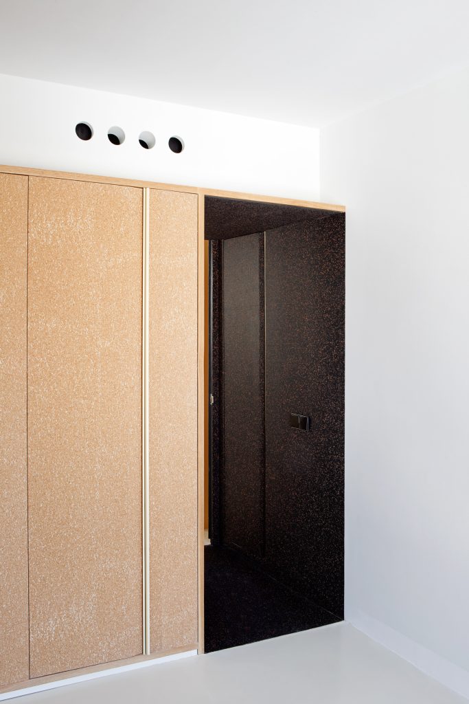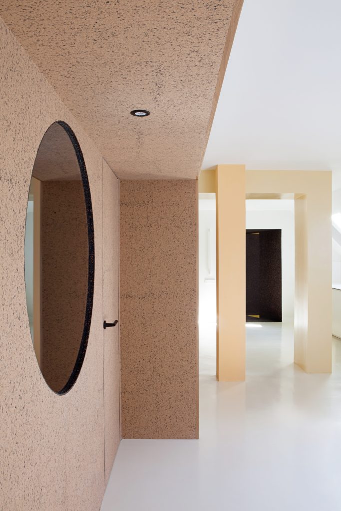 As Southern European cork trees are increasingly sensing the water stress associated to climatic changes, one wonders whether houses could also become drought-resistant in a near future; and which building materials this planet will provide us once humans eventually decide to confront waste. Eliminating circulation space, the project consists of a refurbishment of a penthouse in the centre of Madrid that reorganises the plan to increase available storage and add another room. A direct outcome of conventional housing typologies from the 1990s real estate bubble, the remaining corridorless structure is still readable in two free-standing columns in the living room that work as a portico to the memory of an extinct corridor. Thresholds-to-cross become thresholds-to-stay: a semicircular studiolo connects living room and bedrooms, a pentagonal hallway leads you into one of the bathrooms, and a hidden chamber hosts the new technological brain of the home. The central volume acts as a spine that incorporates storage all along, while compacting circulations, pipes, ducts and cables inside. This all functions as an inhabited sound insulation layer between the day and night zones. Despite almost invisible, the most efficient intervention enhances the climatic performance of the entire home: a new heated floor in winter can switch to a cooling surface in the scorching summers of Madrid, together with an entire new insulation skin for the house that adds thermal comfort while considerably reducing the need for air conditioning. Material and texture choices are based on composites: pieces of cork and recycled rubber. It is this new deconstructed matter what might begin to give us clues about the tactile condition of our surrounding.