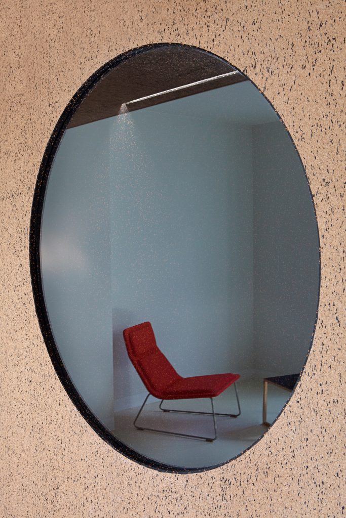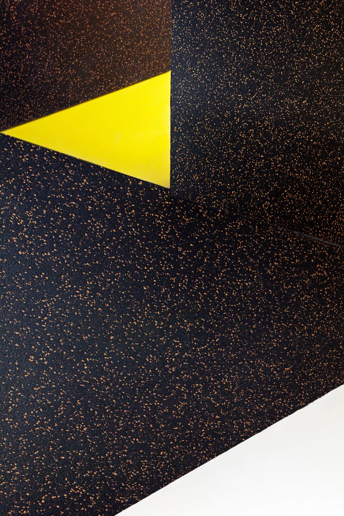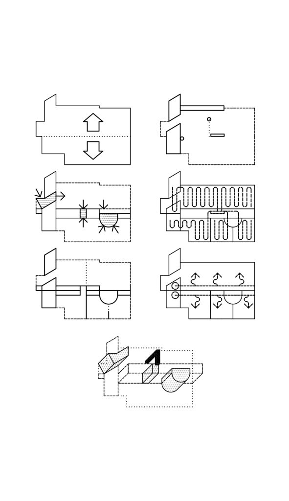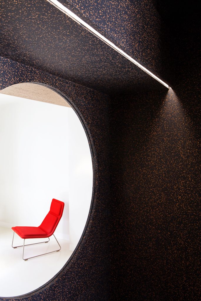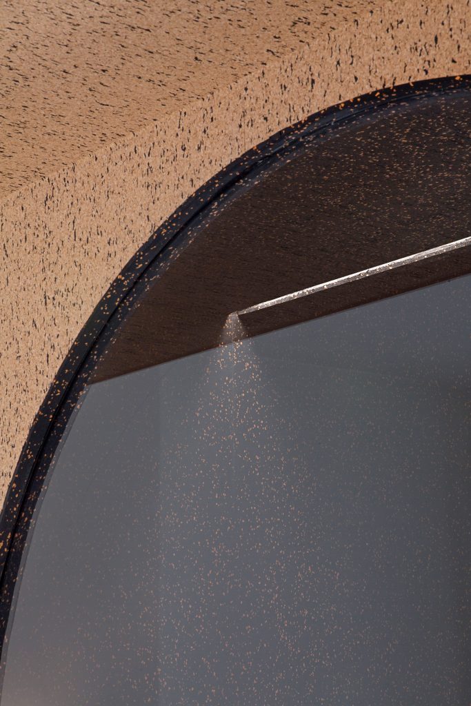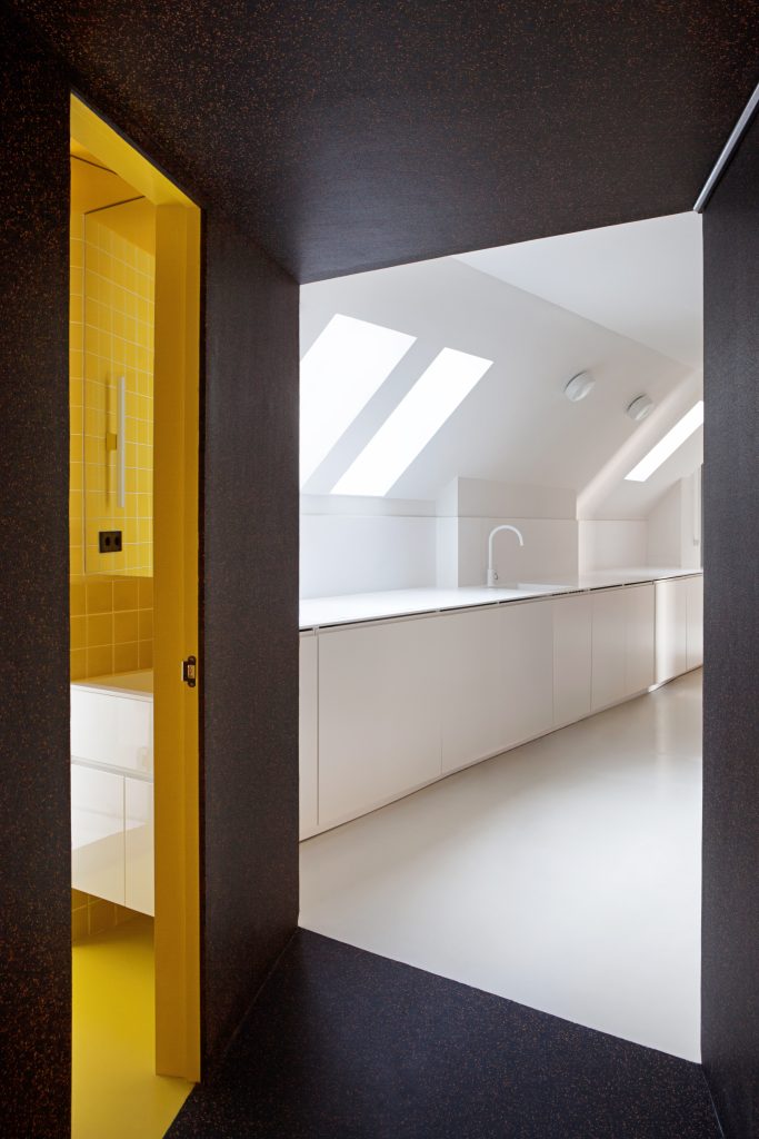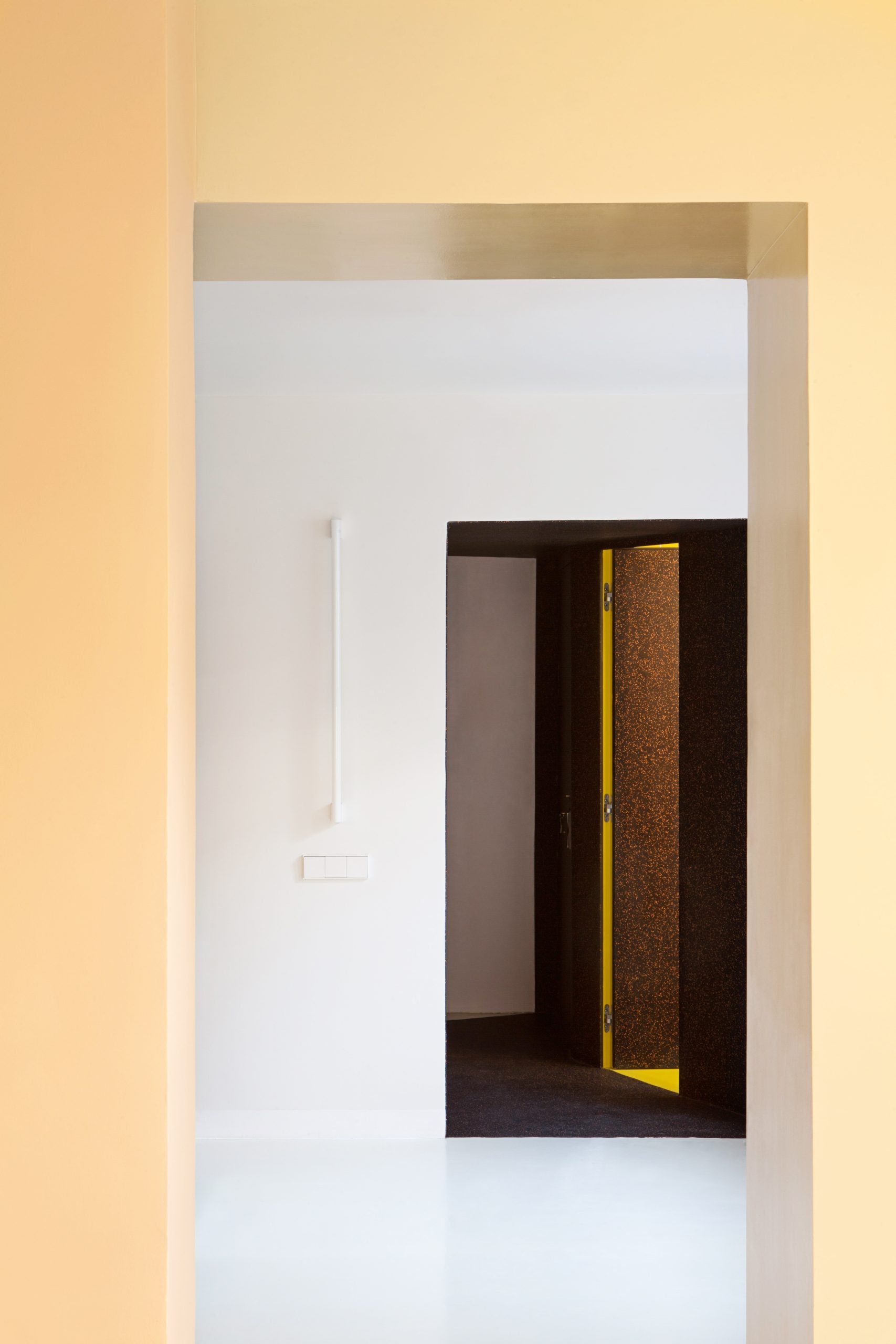 As Southern European cork trees are increasingly sensing the water stress associated to climatic changes, one wonders whether houses could also become drought-resistant in a near future; and which building materials this planet will provide us once humans eventually decide to confront waste. Eliminating circulation space, the project consists of a refurbishment of a penthouse in the centre of Madrid that reorganises the plan to increase available storage and add another room. A direct outcome of conventional housing typologies from the 1990s real estate bubble, the remaining corridorless structure is still readable in two free-standing columns in the living room that work as a portico to the memory of an extinct corridor. Thresholds-to-cross become thresholds-to-stay: a semicircular studiolo connects living room and bedrooms, a pentagonal hallway leads you into one of the bathrooms, and a hidden chamber hosts the new technological brain of the home. The central volume acts as a spine that incorporates storage all along, while compacting circulations, pipes, ducts and cables inside. This all functions as an inhabited sound insulation layer between the day and night zones. Despite almost invisible, the most efficient intervention enhances the climatic performance of the entire home: a new heated floor in winter can switch to a cooling surface in the scorching summers of Madrid, together with an entire new insulation skin for the house that adds thermal comfort while considerably reducing the need for air conditioning. Material and texture choices are based on composites: pieces of cork and recycled rubber. It is this new deconstructed matter what might begin to give us clues about the tactile condition of our surrounding.