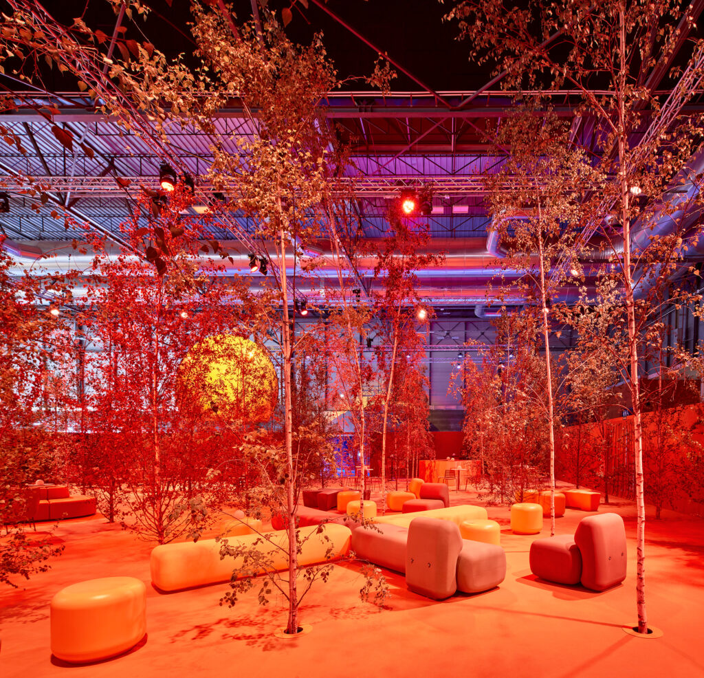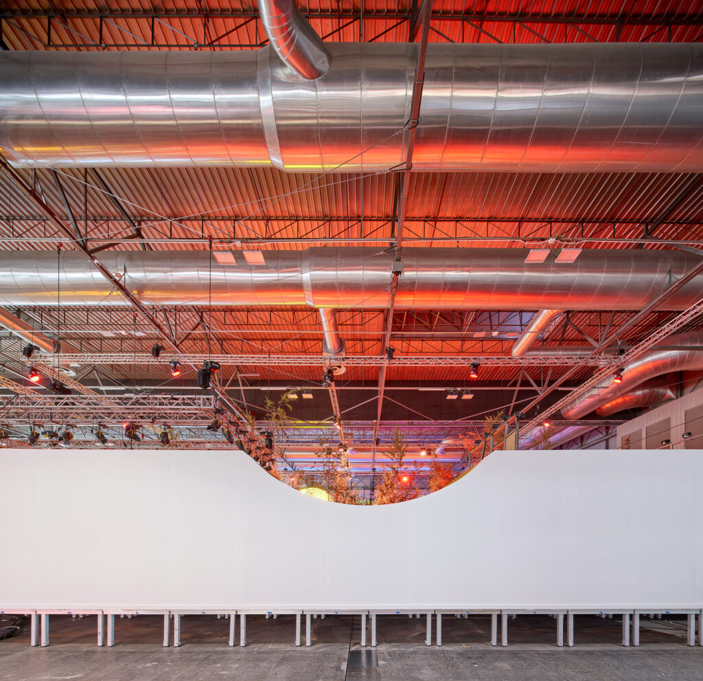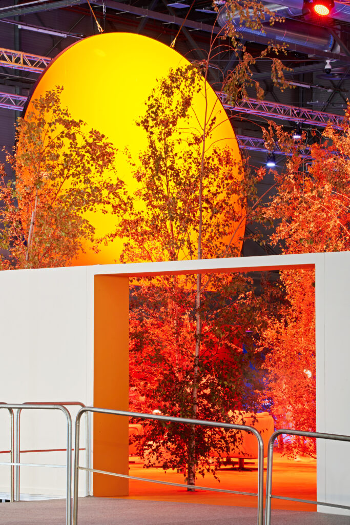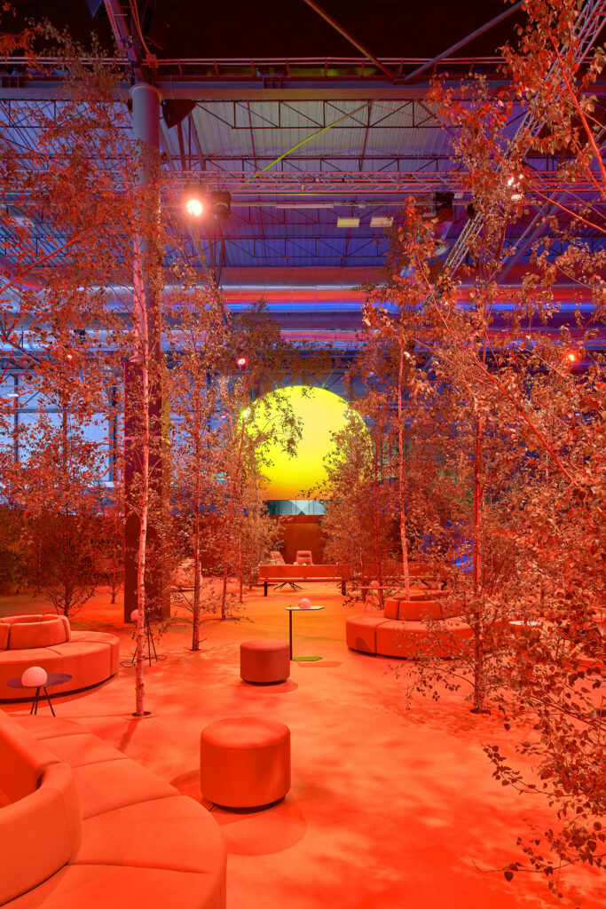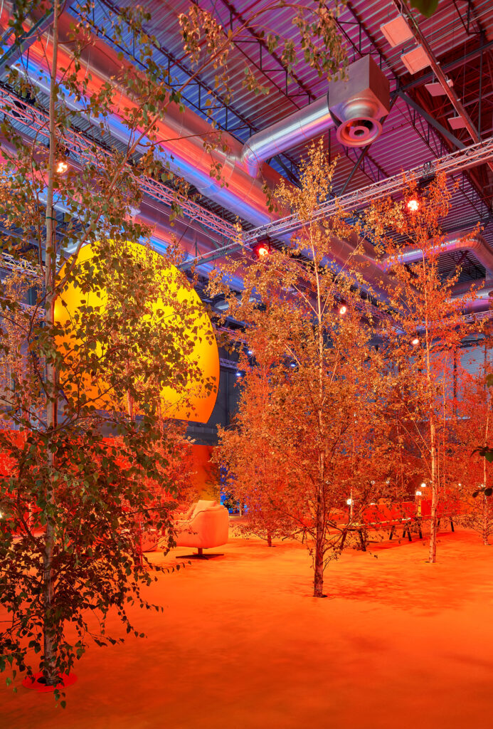 Este pabellón cristaliza un deseo colectivo tras meses de confinamiento, la ilusión de estar en un exterior. El pabellón traslada a los visitantes a un paisaje exterior en el interior de ARCO. Un gran bosque de 100 abedules se dispone sobre la retícula;los arboles se convierten así en balizas naturales que ordenan las relaciones personales de todos los invitados y construyen una atmosfera ficticia y lúdica. Los abedules, al acabar la feria, serán replantados en una nueva ubicación. Volverán al exterior asegurando de esta forma que el residuo que deja la construcción del pabellón y su huella ecológica sean mínimos, el bosque de abedules tendrá la capacidad de seguir desarrollándose más allá de este encuentro efímero. Por último, un enorme sol corona este lugar en un atardecer permanente, una ensoñación.