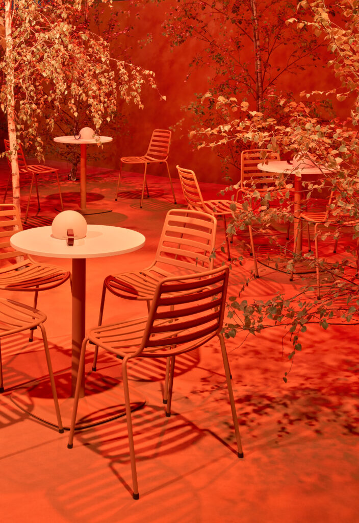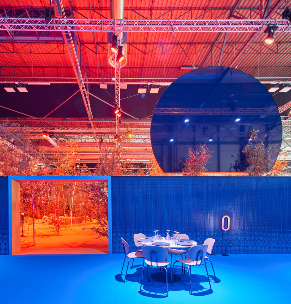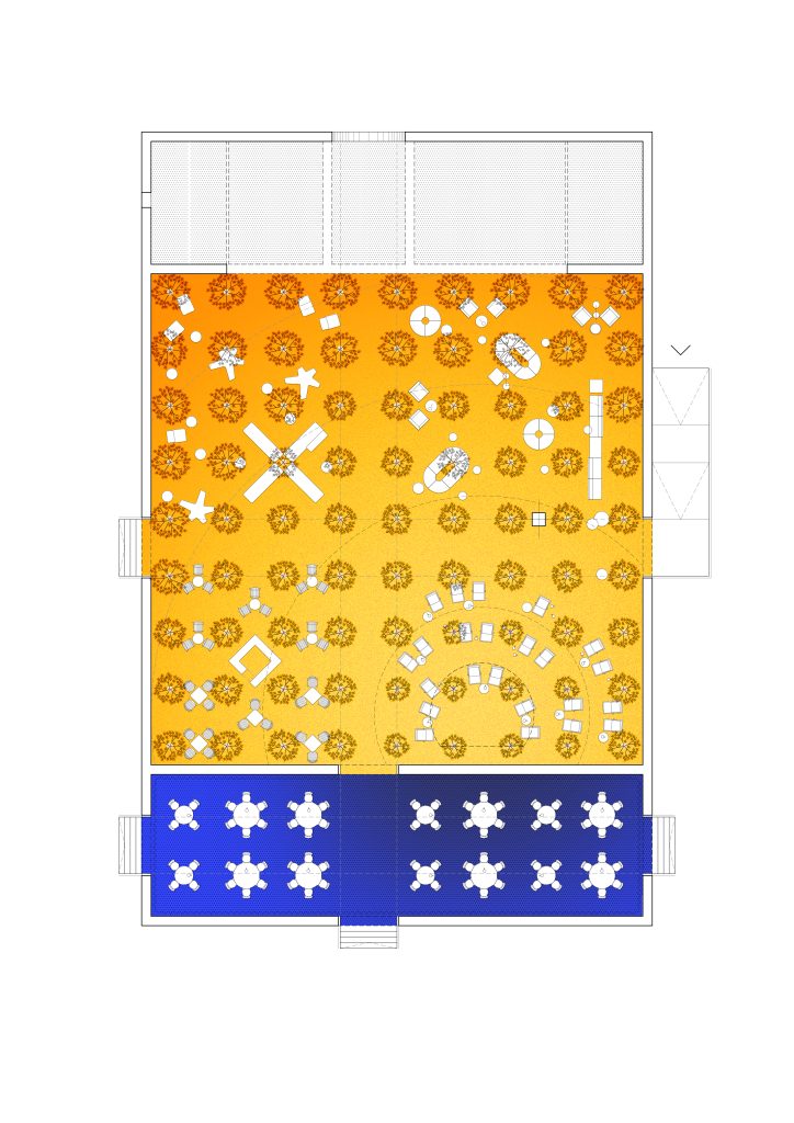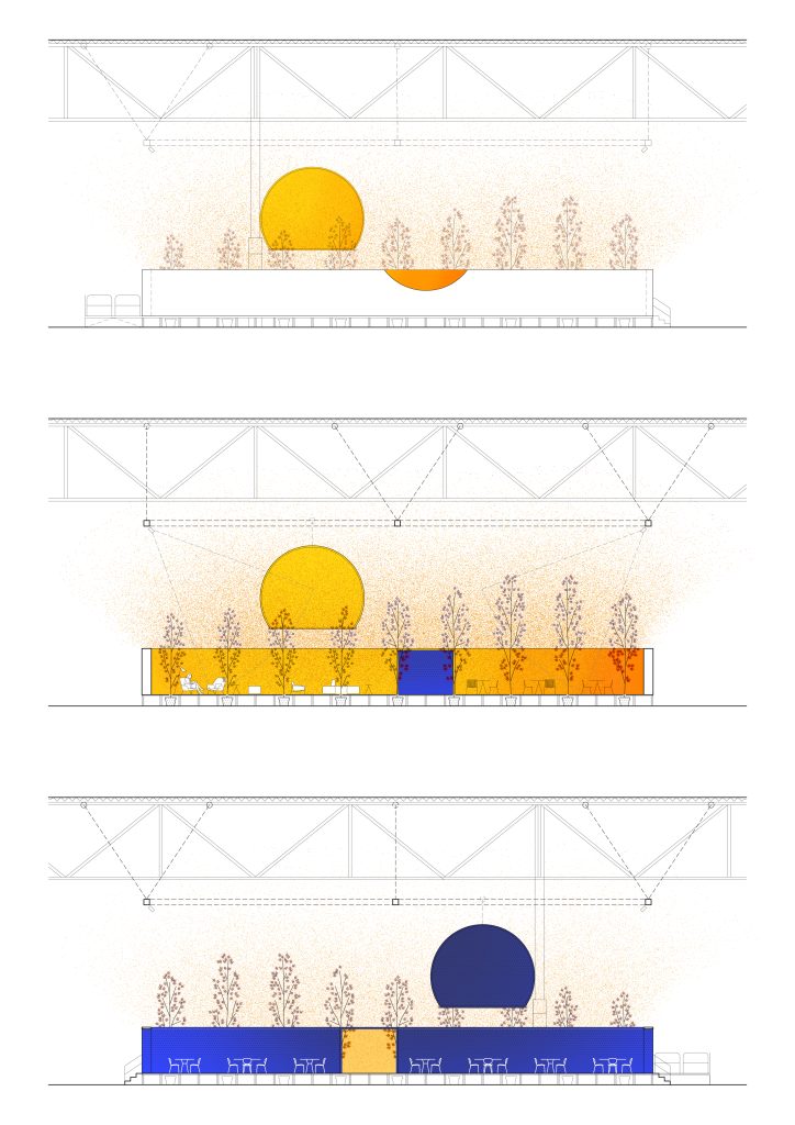 Este pabellón cristaliza un deseo colectivo tras meses de confinamiento, la ilusión de estar en un exterior. El pabellón traslada a los visitantes a un paisaje exterior en el interior de ARCO. Un gran bosque de 100 abedules se dispone sobre la retícula;los arboles se convierten así en balizas naturales que ordenan las relaciones personales de todos los invitados y construyen una atmosfera ficticia y lúdica. Los abedules, al acabar la feria, serán replantados en una nueva ubicación. Volverán al exterior asegurando de esta forma que el residuo que deja la construcción del pabellón y su huella ecológica sean mínimos, el bosque de abedules tendrá la capacidad de seguir desarrollándose más allá de este encuentro efímero. Por último, un enorme sol corona este lugar en un atardecer permanente, una ensoñación.