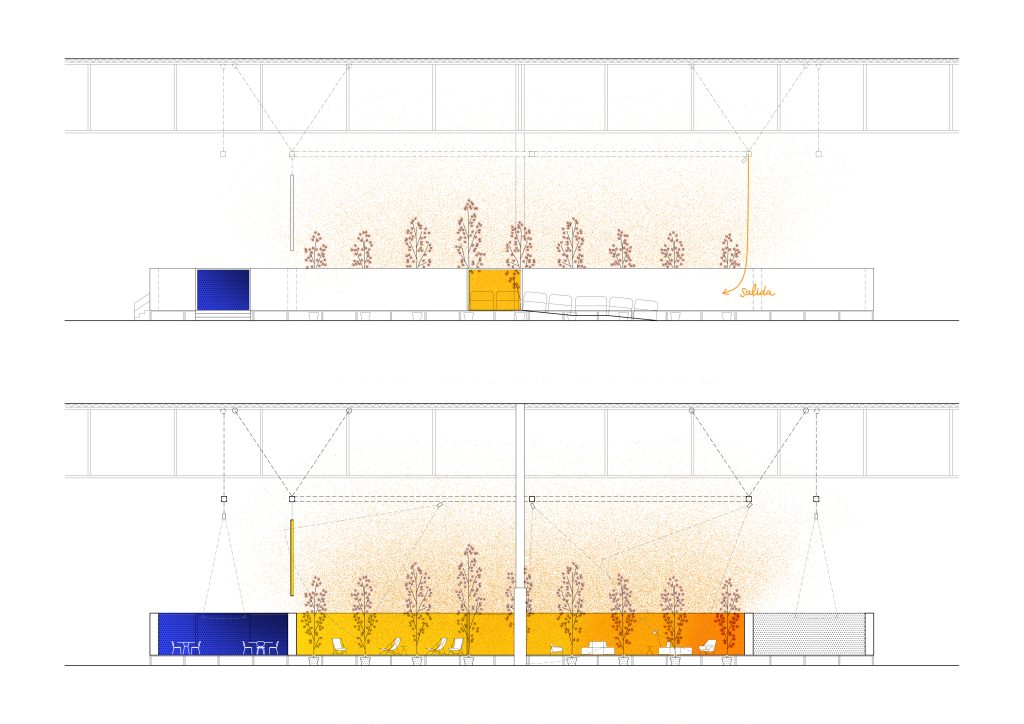 “SALIDA” es un proyecto que visibiliza y naturaliza las distancias de seguridad que se han establecido durante la pandemia, una suerte de celebración de cómo los cuerpos se relacionan en el espacio público una vez que hemos interiorizado las nuevas métricas que pautan nuestros encuentros. El pabellón materializa esa distancia en una retícula de 3×3 metros capaz de operar como un balizamiento del interior de la sala VIP y que acaba por definir espacios donde encontrarse y relacionarse de manera segura.