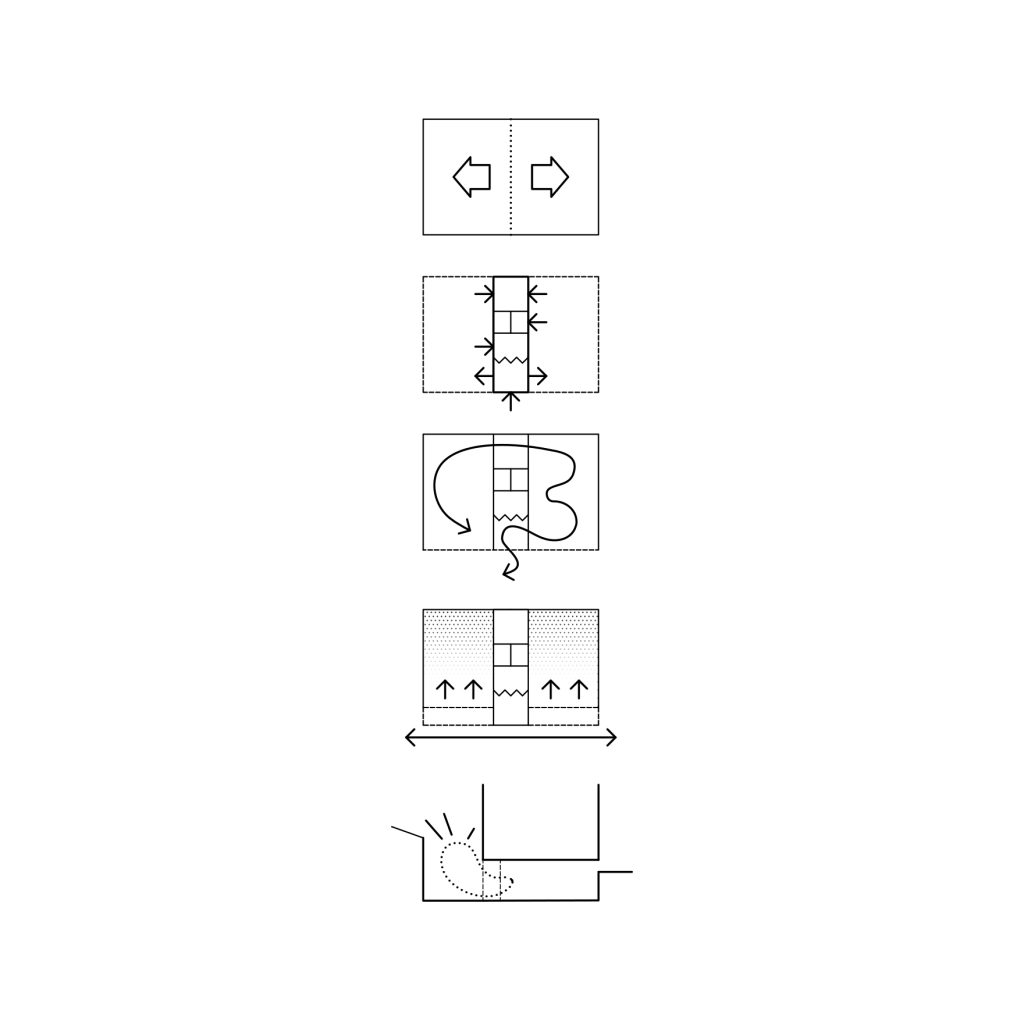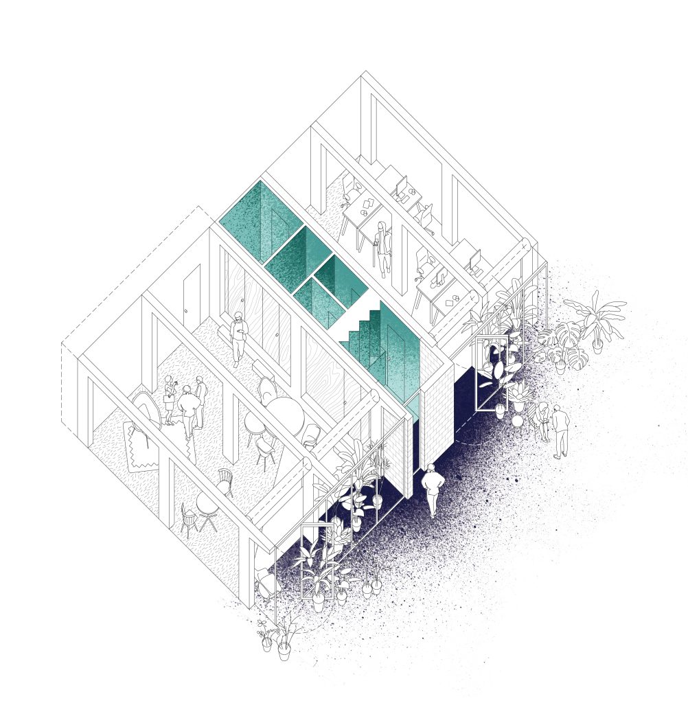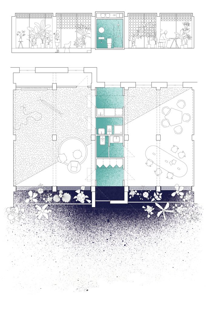 Se plantea por tanto un espacio contingente y afectivo que favorezcan las relaciones sociales y laborales a través de una serie de premisas: máximo aprovechamiento, compartir servicios y participar del callejón. Para simultanear programas y a su vez hacer posible que convivan todos los deseos y acontecimientos futuribles de la propietaria, el local se divide en dos espacios gemelos. Gracias a una pieza compartida que contiene diferentes servicios e instalaciones. Climatización, baños, cocina, taquillas y entrada son compartidos por ambos lados. La compacidad de este elemento permite el aprovechamiento máximo del local. En la fachada se propone un espacio intermedio, entre el exterior y el interior, que sustituye a un muro de ladrillo. Un filtro vegetal, un velo de seguridad y un contenedor de afectos son las estrategias de diseño que hacen más práctico y deseable, tanto el interior del local como el paso por el callejón.