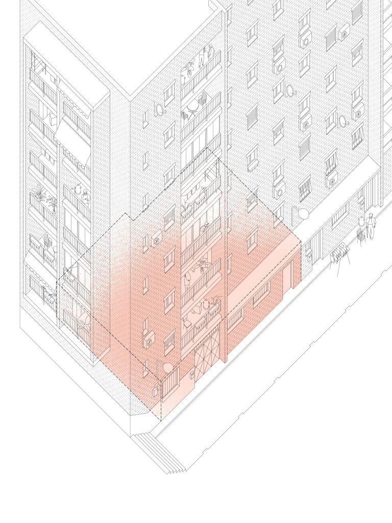 Un presupuesto muy ajustado determina la localización en la periferia de la ciudad. Surge como oportunidad asequible un semisótano poco iluminado. El local se encuentra en un callejón peatonal perteneciente a un conjunto de viviendas sociales de los años 60, degradadas y de baja calidad.